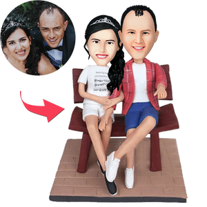 Celebrate your special connection with our beautifully crafted custom couple bobblehead. This handmade polymer clay sculpture captures your likeness in a charming seated pose, complete with personalised engraved text to make it truly unforgettable.