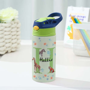 Personalised 12oz Stainless Steel Water Bottle with Straw | Kids Jungle Animal Design | Custom Name Gift