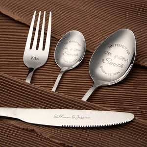 Elevate your special day with our exquisite personalised wedding forks set, expertly crafted to add a touch of elegance and sentiment to your first meal as newlyweds. These beautifully engraved 'Mr & Mrs' forks serve as both practical tableware and cherished keepsakes that celebrate your unique love story.