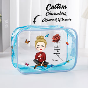 Personalised Cartoon Girl Birth Flower Clear Makeup Bag with Name - Custom Birthday Gift for Her