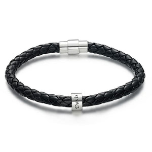 Elevate your everyday style with our exquisitely crafted men's leather bracelet, designed for those who appreciate the finer details. Made from premium black leather and accented with sleek, sophisticated black beads, this bracelet offers a timeless accessory that complements both casual and formal attire. The centrepiece is our custom engraving bead, allowing you to personalise it with up to six meaningful characters—be it a name, a significant date, or a powerful mantra.