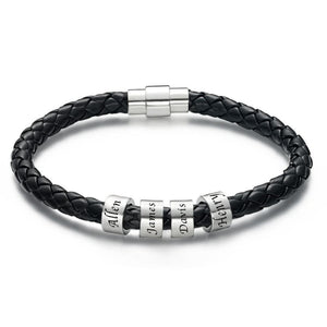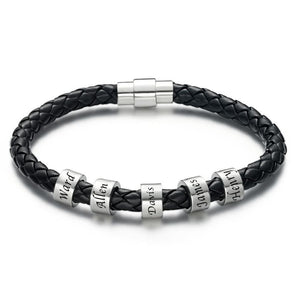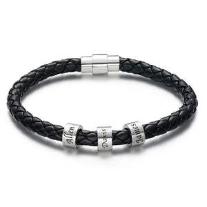 Men's Custom Engraved Black Leather Bead Bracelet | 1-6 Charms Personalised Gift