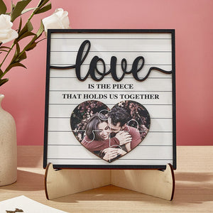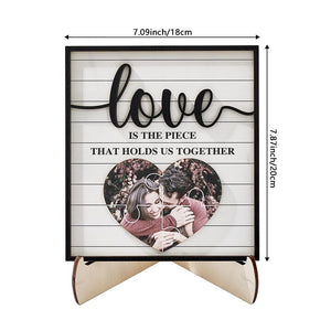 Celebrate your unique bond with this beautifully crafted personalised wooden photo plaque, engraved with the touching sentiment: 'Love Is The Piece That Holds Us Together'. This isn't just a gift; it's a timeless keepsake that captures a precious memory, making it the perfect Valentine's Day gift, anniversary present, or wedding gift that will be treasured for years to come.