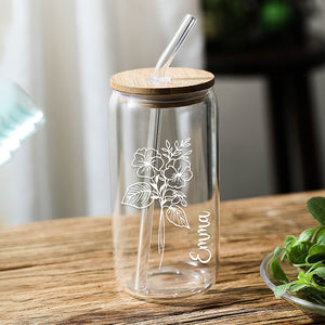 Personalised Name Glass Can with Birth Flower - Custom Gift for Mum, Friends & Bridesmaids