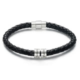 Elevate your everyday style with our exquisitely crafted men's leather bracelet, designed for those who appreciate the finer details. Made from premium black leather and accented with sleek, sophisticated black beads, this bracelet offers a timeless accessory that complements both casual and formal attire. The centrepiece is our custom engraving bead, allowing you to personalise it with up to six meaningful characters—be it a name, a significant date, or a powerful mantra.