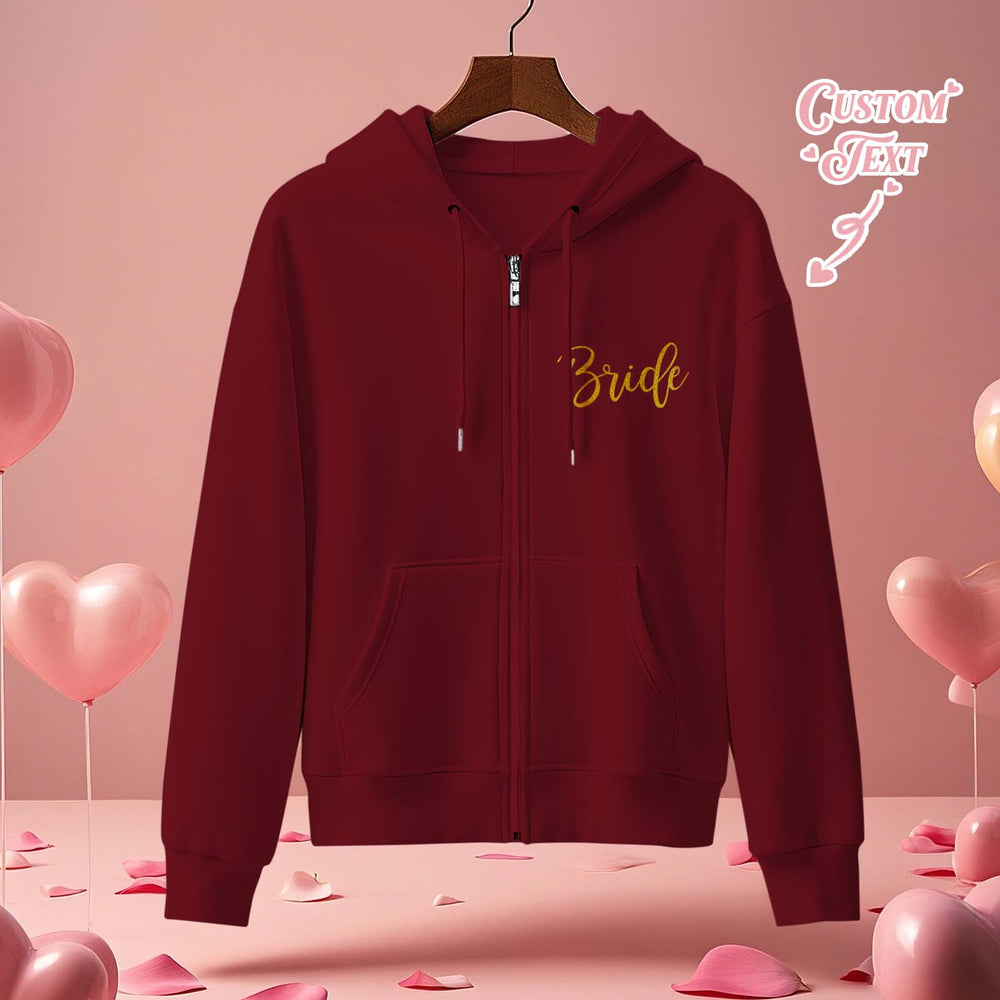 Designed exclusively for the contemporary bride, our personalised Mrs Bride hoodie combines fashion with sentimental value. This custom zip-up hoodie serves as the ideal gift for weddings, bridal showers, bachelorette parties, or hen nights – allowing you to express your heartfelt wishes to the special woman in your life.