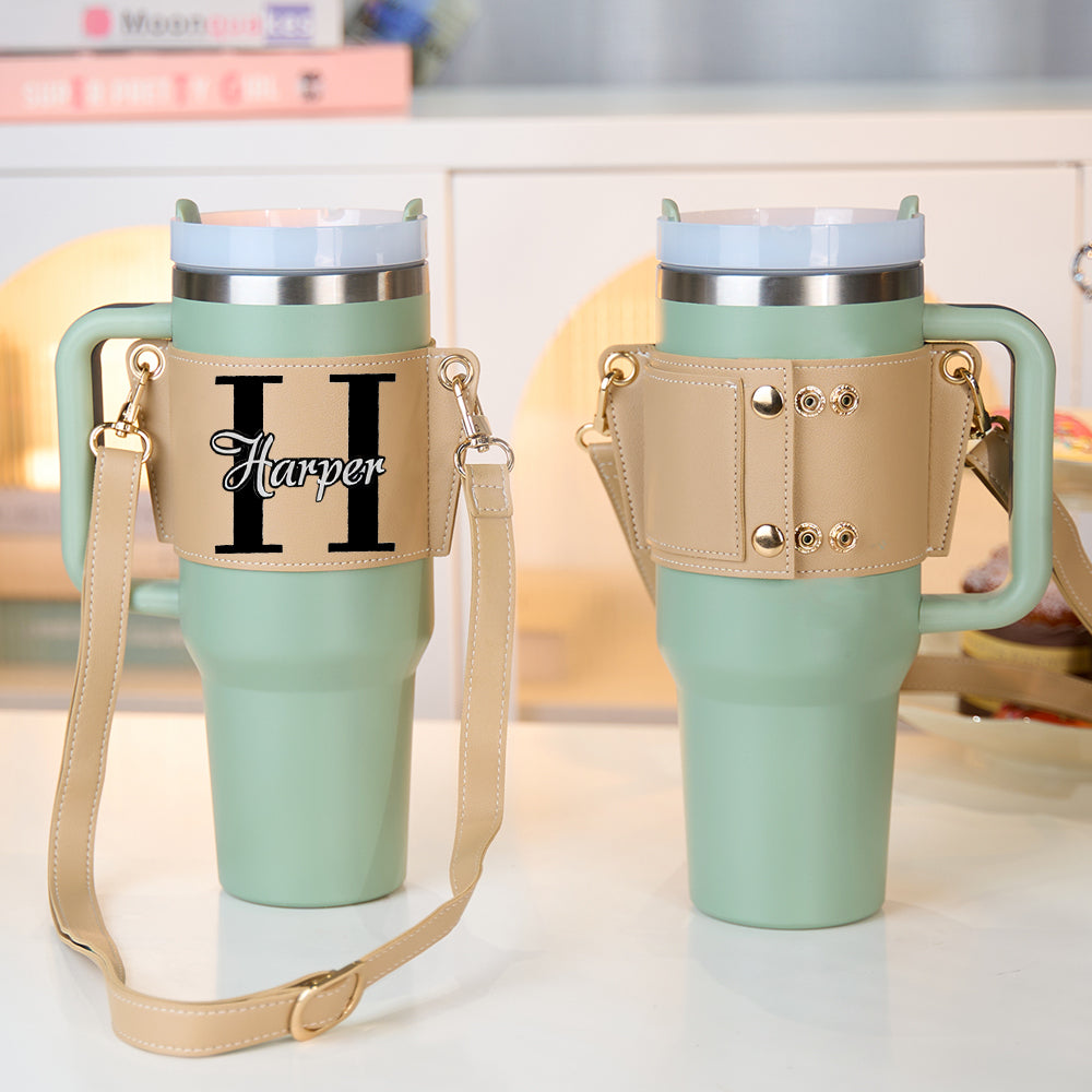 Introducing our premium personalised water bottle carrier bag, specially designed for your 40oz Stanley tumbler. Crafted from high-quality PU leather, this elegant carrier combines functionality with personalised style, making it the perfect companion for your hydration needs.